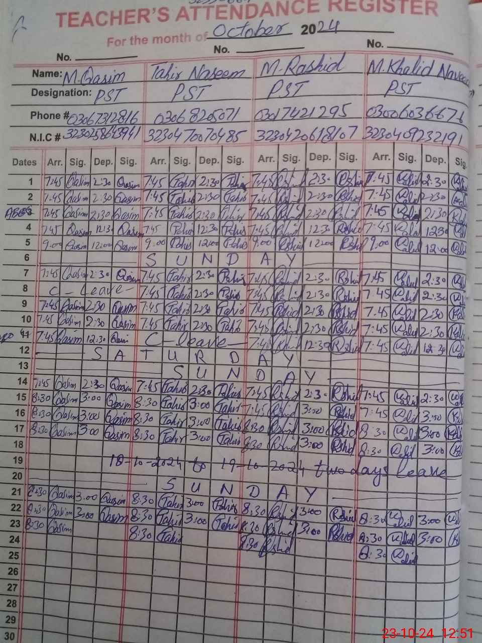 | Name: M.**** Designation: (School Headmaster's/Headmistress's) PST Phone/Cell Number: 03**** |