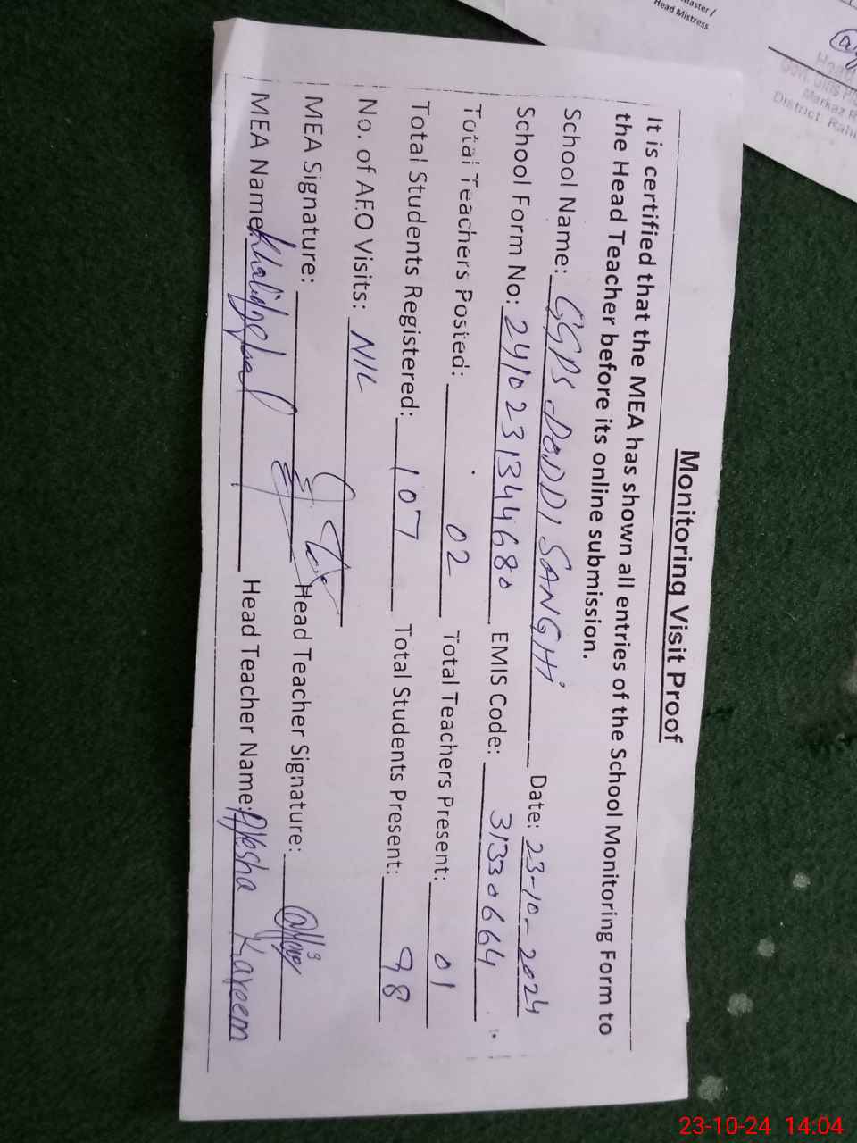 | EMIS Code: 31330664 | Name of School: GGPS DODDI SANGHI BASTI MASTER KHUDA BUX MAHER | |||