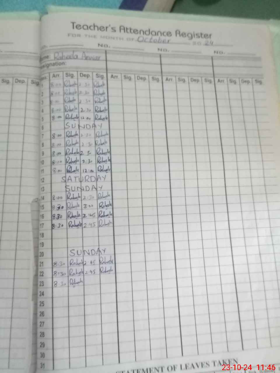 | CNIC | Full Name | Designation | R/C | Absence During Last Calender Month |
