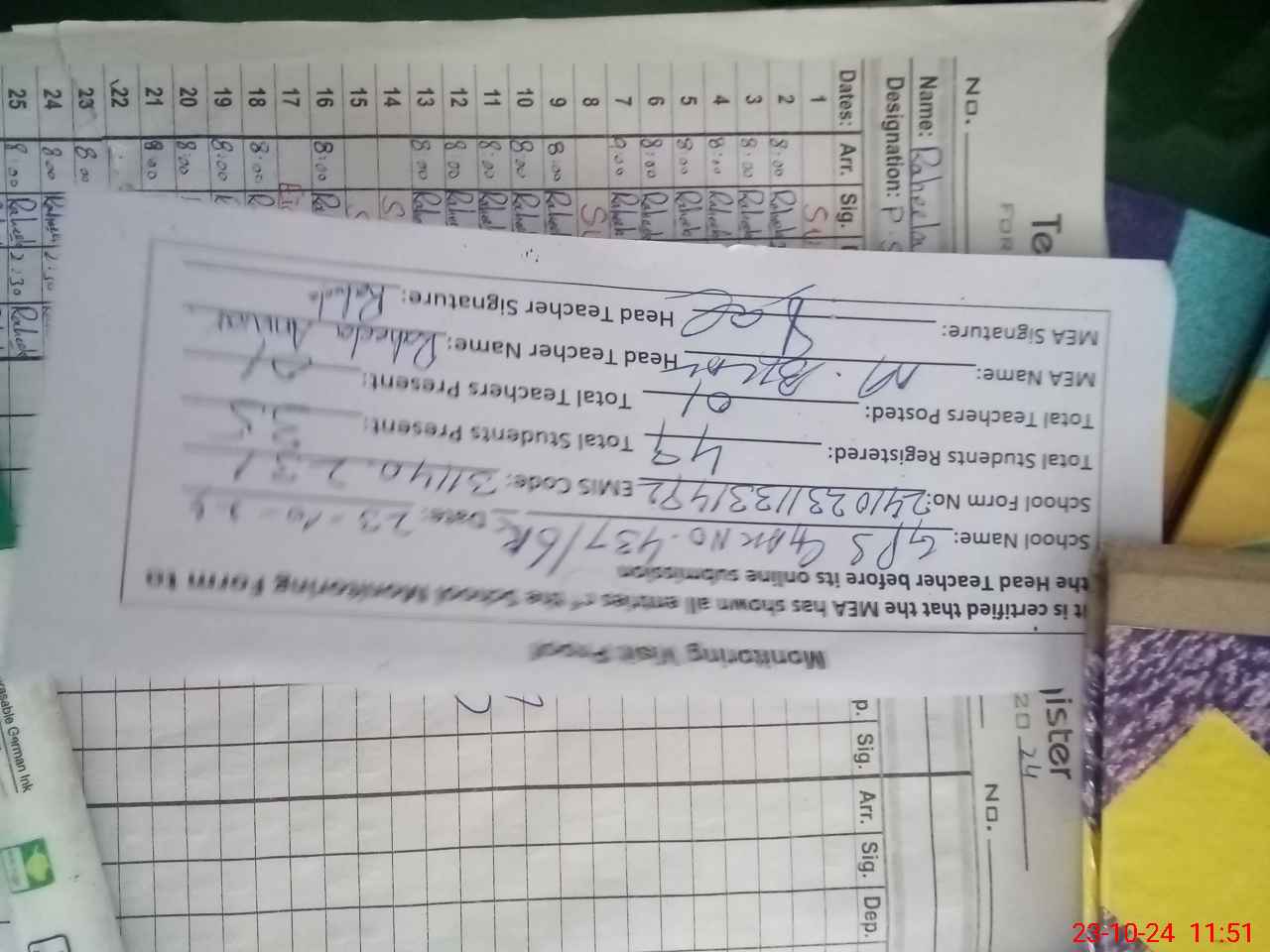 | Attendance Register | Head Teacher | MEA with School | Visit Proof |