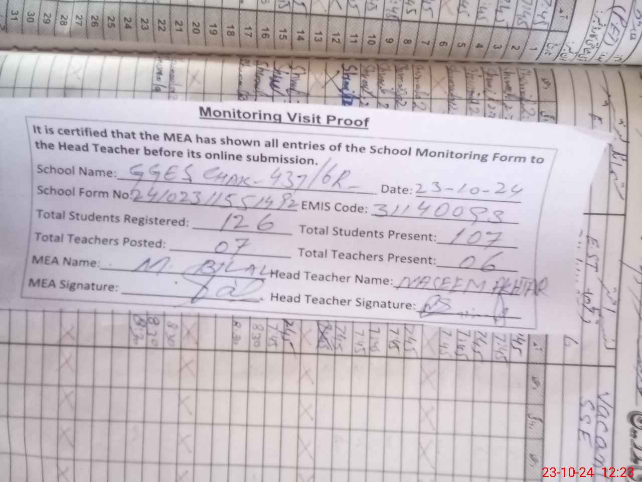 | Attendance Register | Head Teacher | MEA with School | Visit Proof |