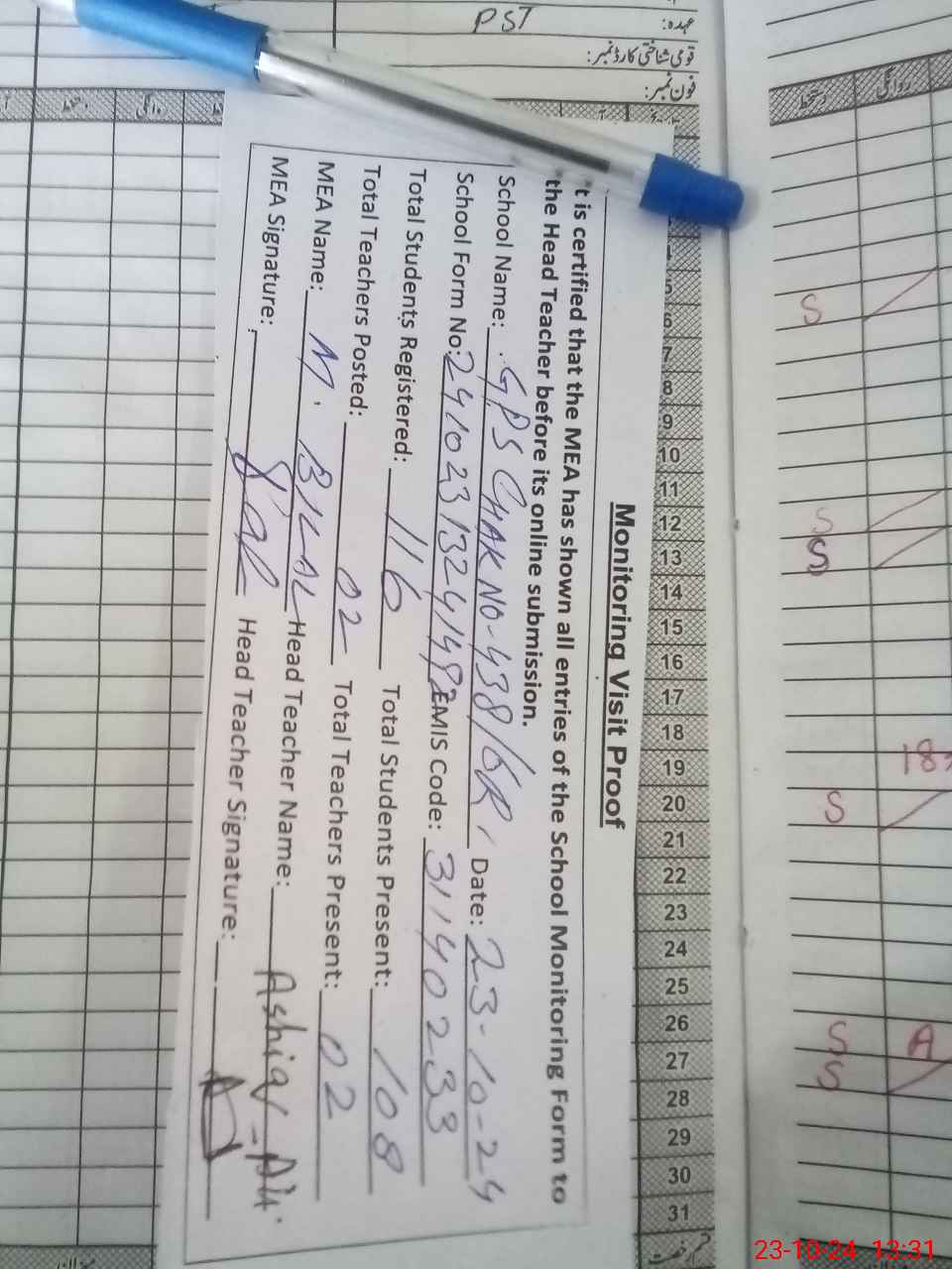 | Attendance Register | Head Teacher | MEA with School | Visit Proof |