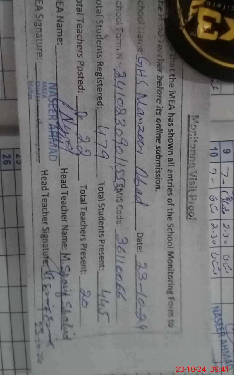 | Monitoring Date: 23-10-2024 | Start Time: 23-10-2024 09:01 AM | End Time: 23-10-2024 09:43 AM | Name of MEA: Na**** Ah**** | |