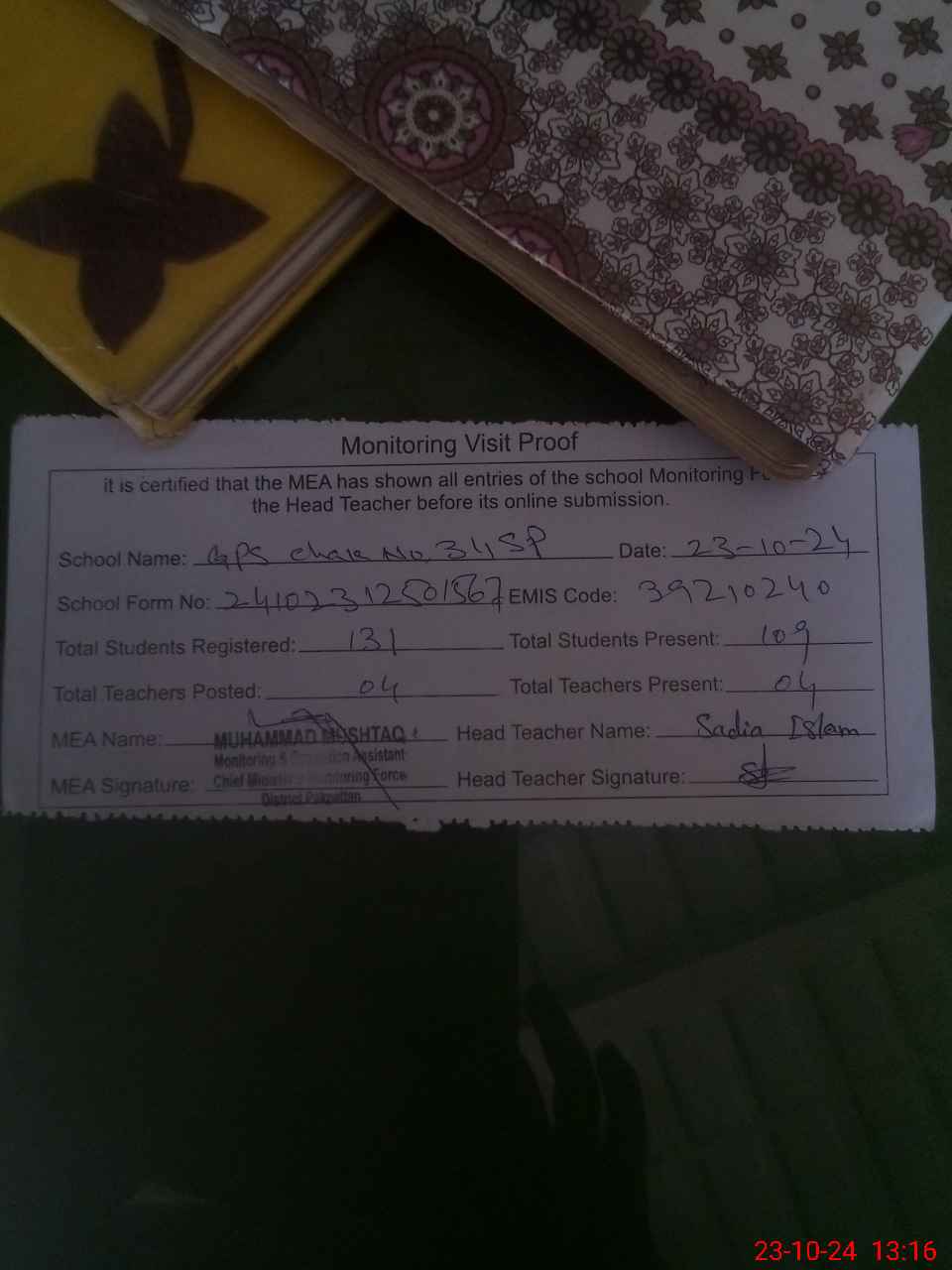 | Attendance Register | Head Teacher | MEA with School | Visit Proof |