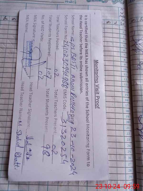 | EMIS Code: 31320254 | Name of School: GPS BASTI ABDUL RASHEED SIAL | |||