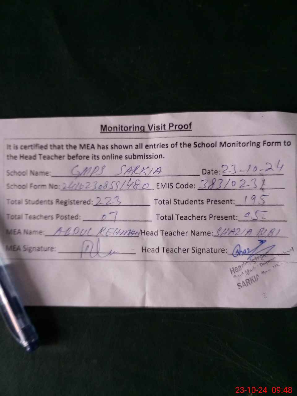 | Attendance Register | Head Teacher | MEA with School | Visit Proof |