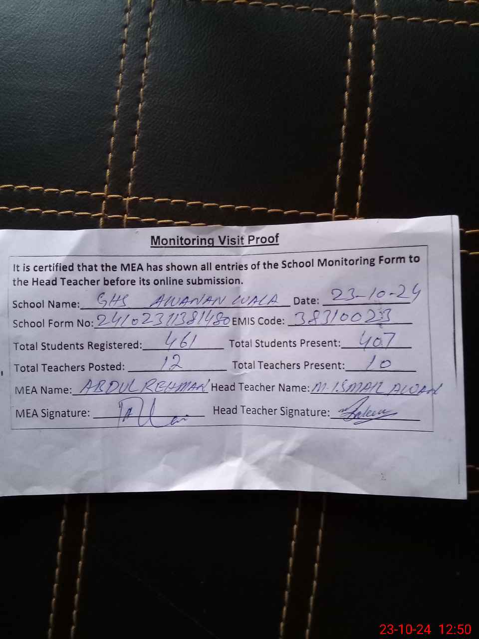 | EMIS Code: 38310023 | Name of School: GHS AWANAN WALA | |||