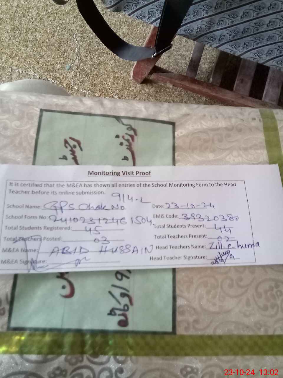 | Attendance Register | Head Teacher | MEA with School | Visit Proof |