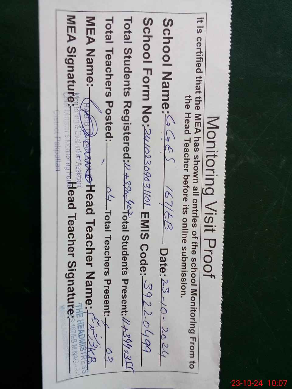 | Attendance Register | Head Teacher | MEA with School | Visit Proof |