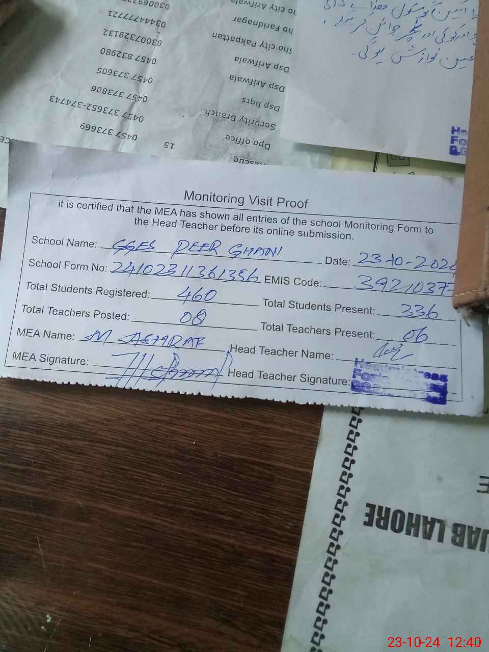 | Certified that this School was Inspected by the Undersigned MEA/DMO Today and the Information Stated Above is as Per Record. | |||||