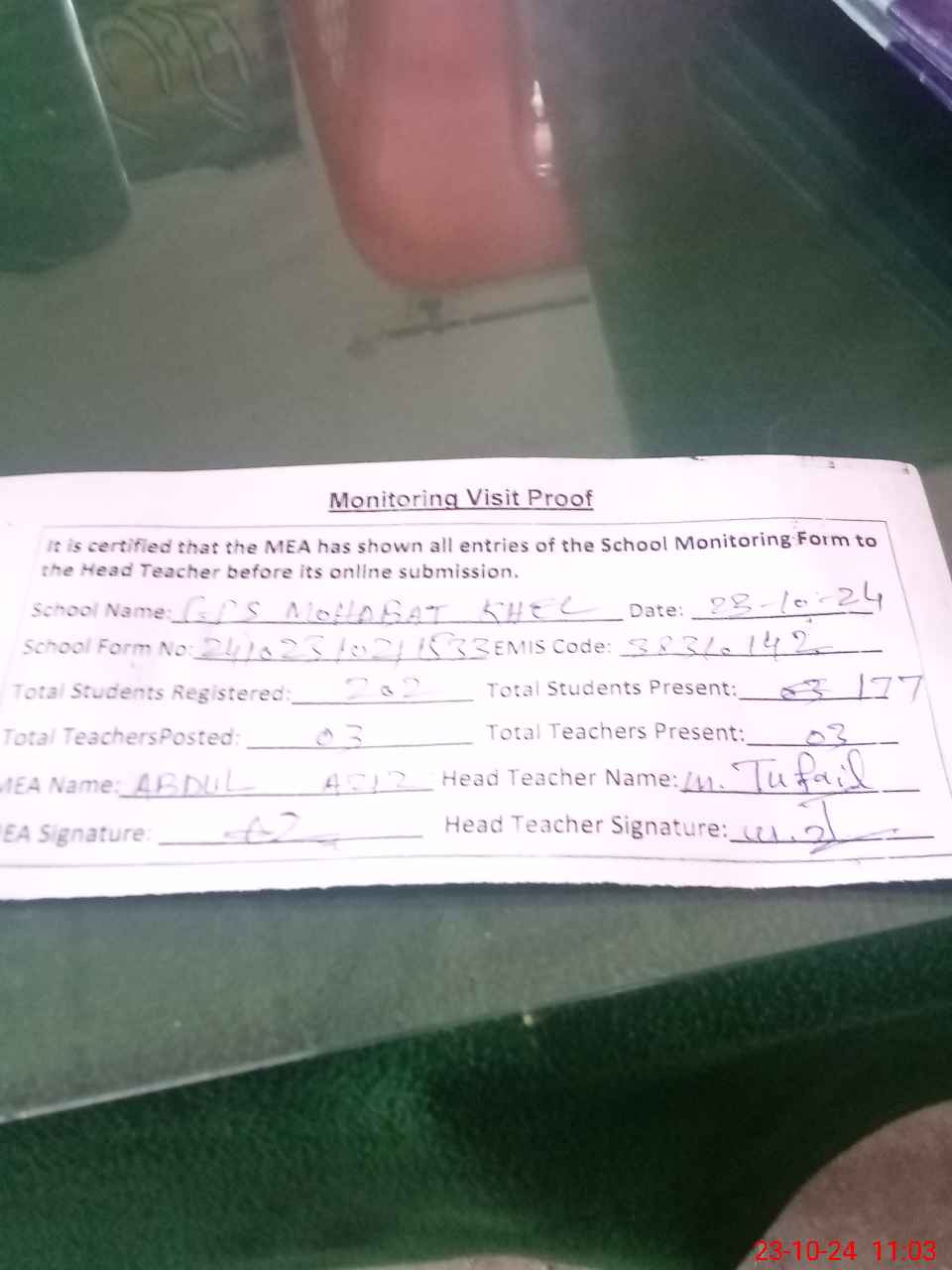 | Attendance Register | Head Teacher | MEA with School | Visit Proof |