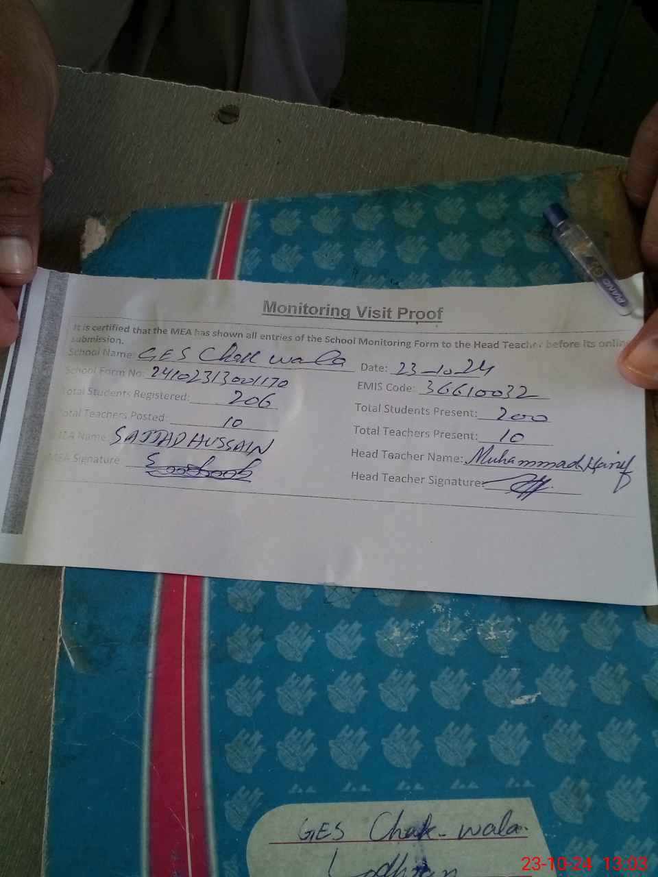 | Attendance Register | Head Teacher | MEA with School | Visit Proof |