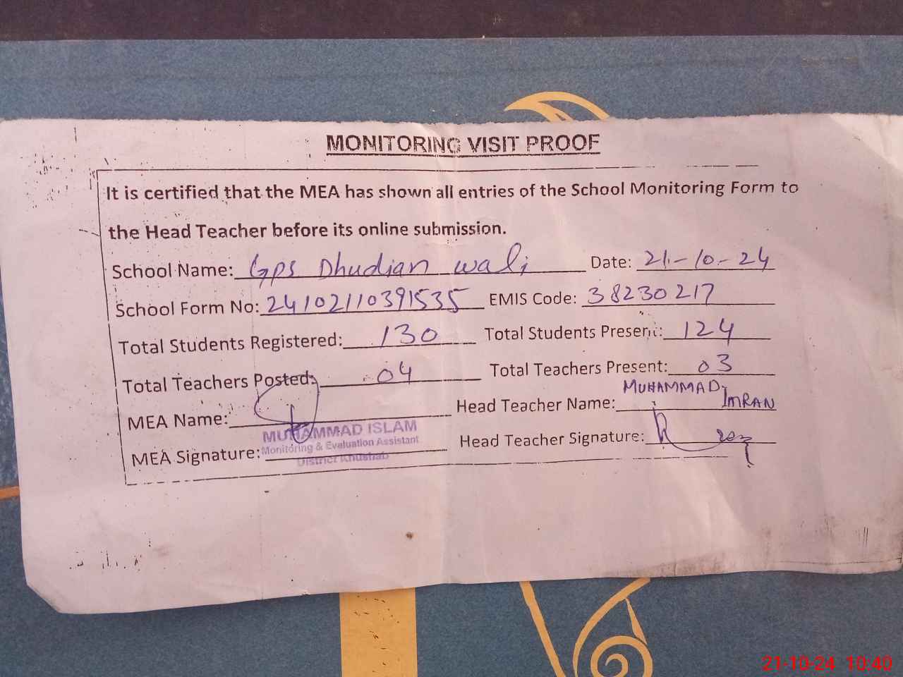 | Attendance Register | Head Teacher | MEA with School | Visit Proof |