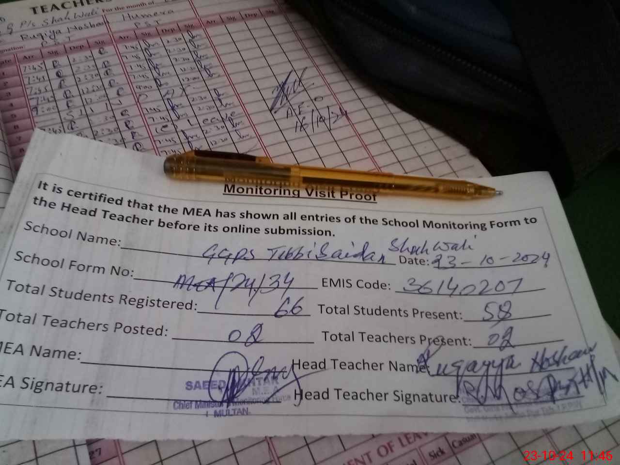 | Attendance Register | Head Teacher | MEA with School | Visit Proof |