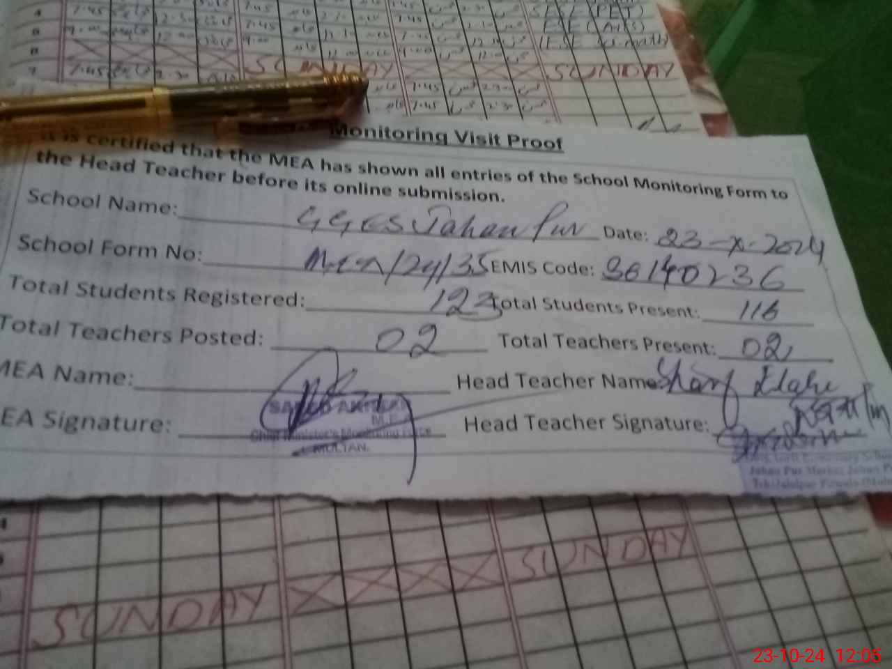 | Attendance Register | Head Teacher | MEA with School | Visit Proof |