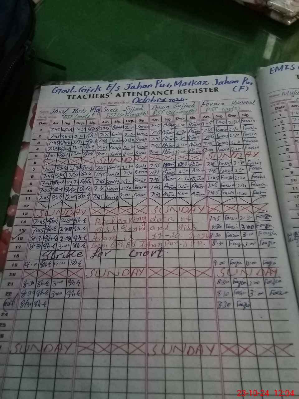 | CNIC | Full Name | Designation | R/C | Absence During Last Calender Month |