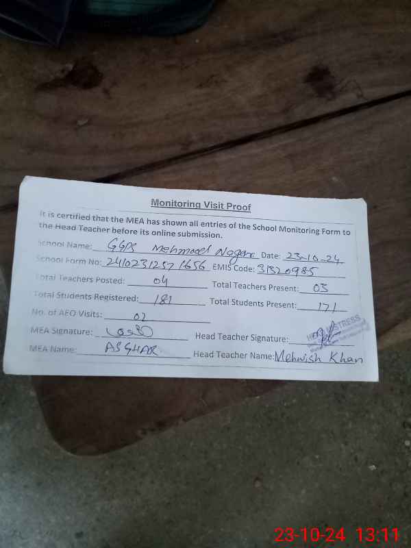 | EMIS Code: 31320985 | Name of School: GGPS MAHMOOD NAGAR | |||