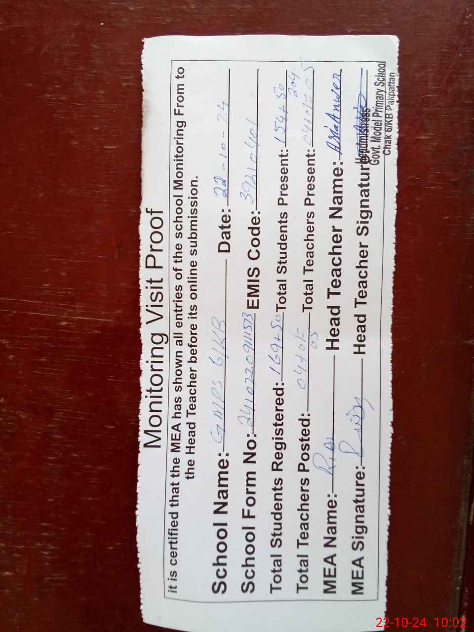 | Attendance Register | Head Teacher | MEA with School | Visit Proof |