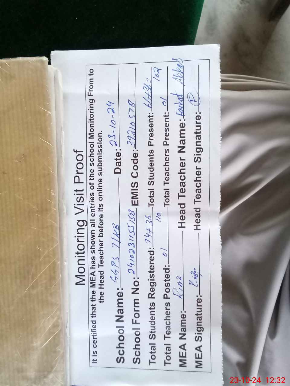 | Attendance Register | Head Teacher | MEA with School | Visit Proof |
