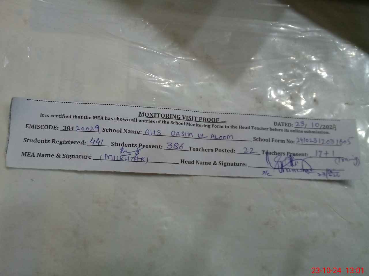 | EMIS Code: 38420029 | Name of School: GHS JAMIA QASIM UL ULOOM JINNAH COLONY | |||