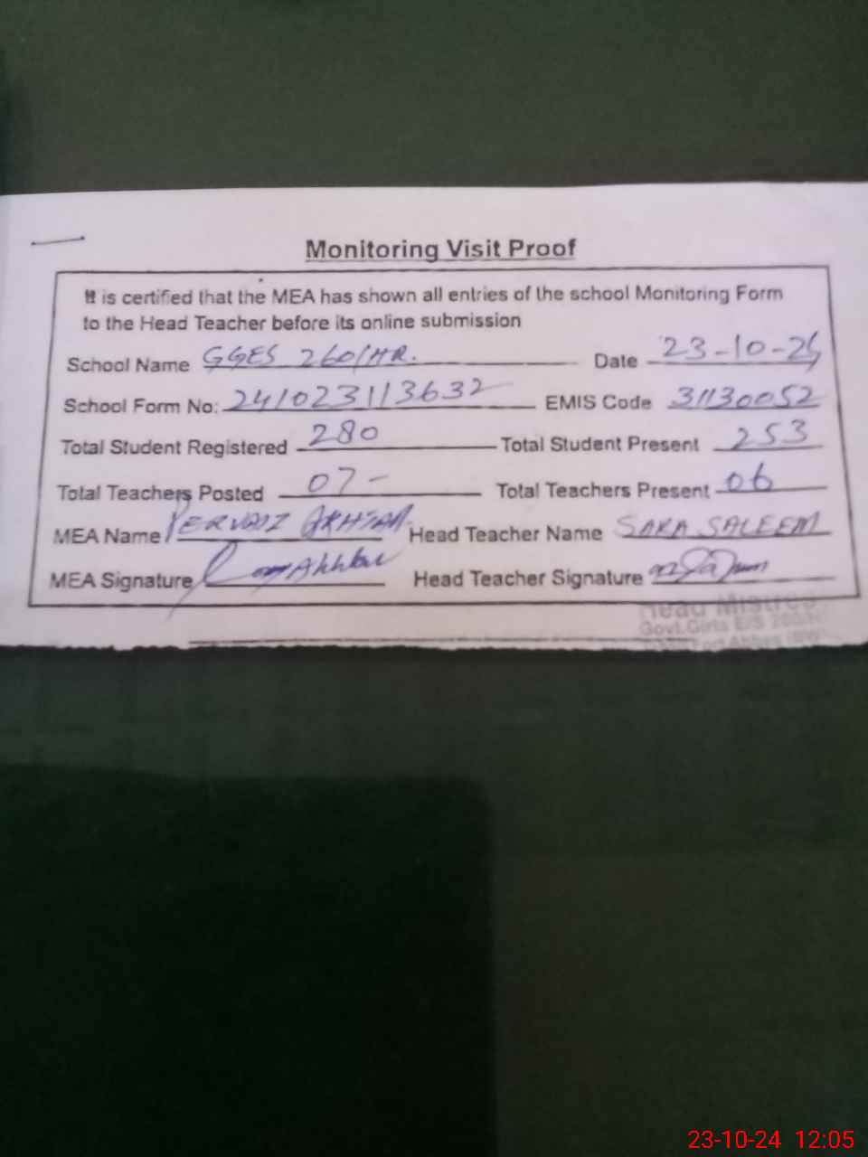 | Attendance Register | Head Teacher | MEA with School | Visit Proof |