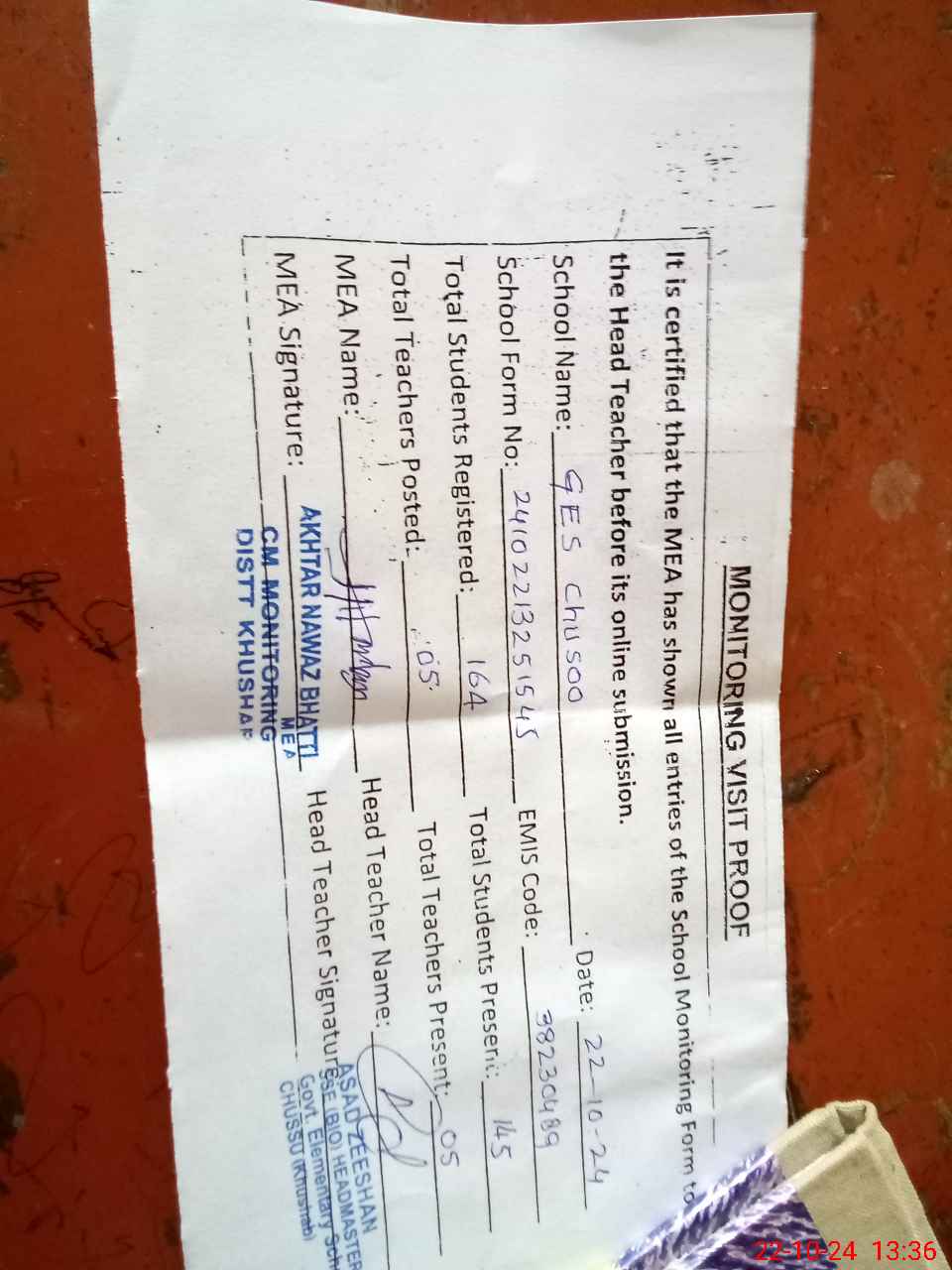 | Attendance Register | Head Teacher | MEA with School | Visit Proof |