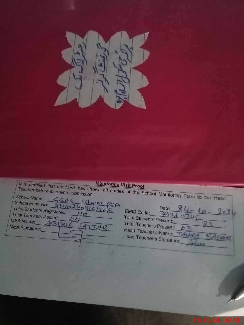 | Attendance Register | Head Teacher | MEA with School | Visit Proof |