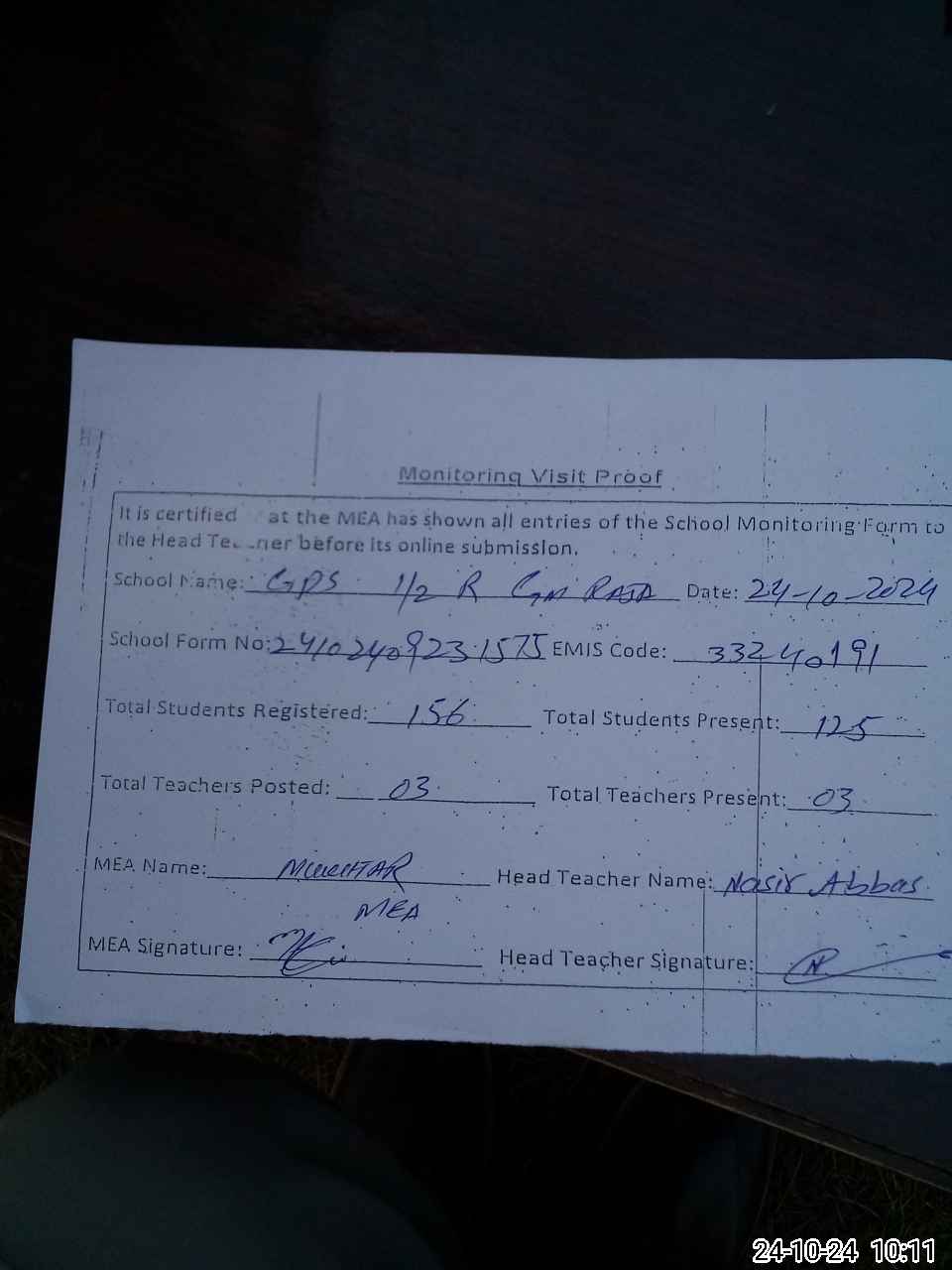 | Attendance Register | Head Teacher | MEA with School | Visit Proof |
