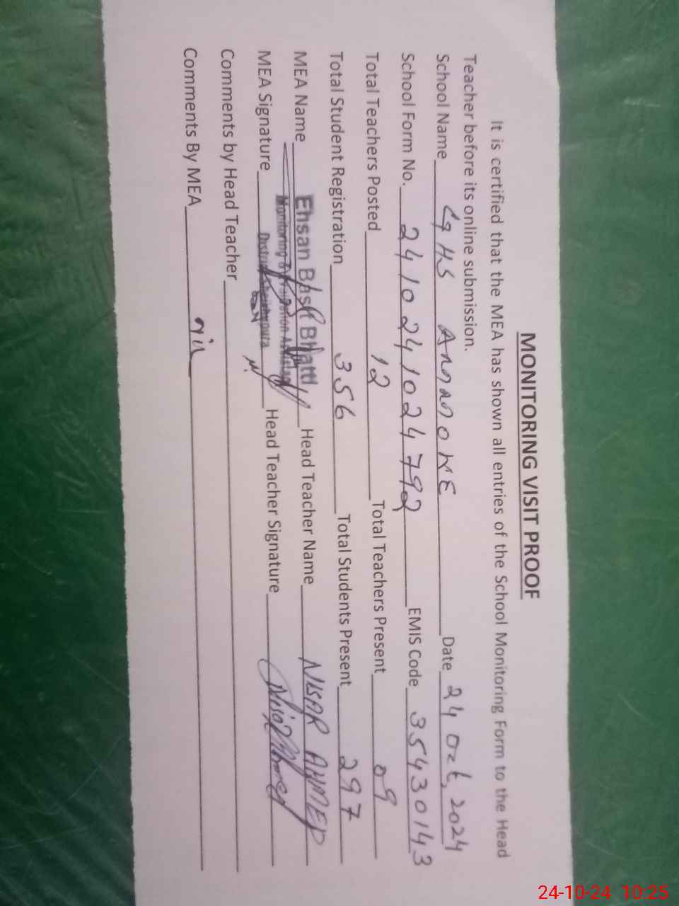| Certified that this School was Inspected by the Undersigned MEA/DMO Today and the Information Stated Above is as Per Record. | |||||