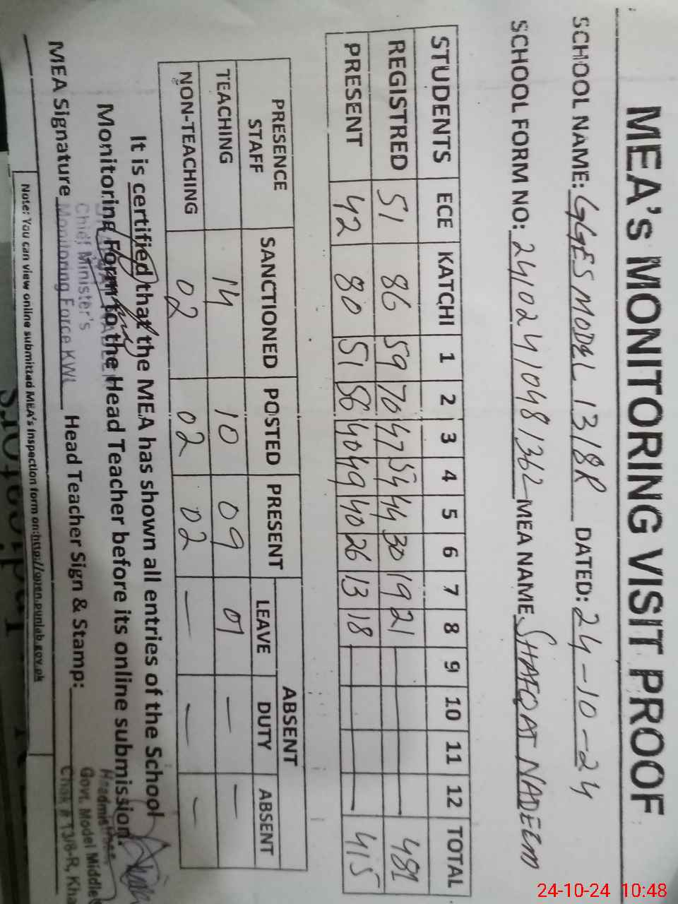 | Certified that this School was Inspected by the Undersigned MEA/DMO Today and the Information Stated Above is as Per Record. | |||||
