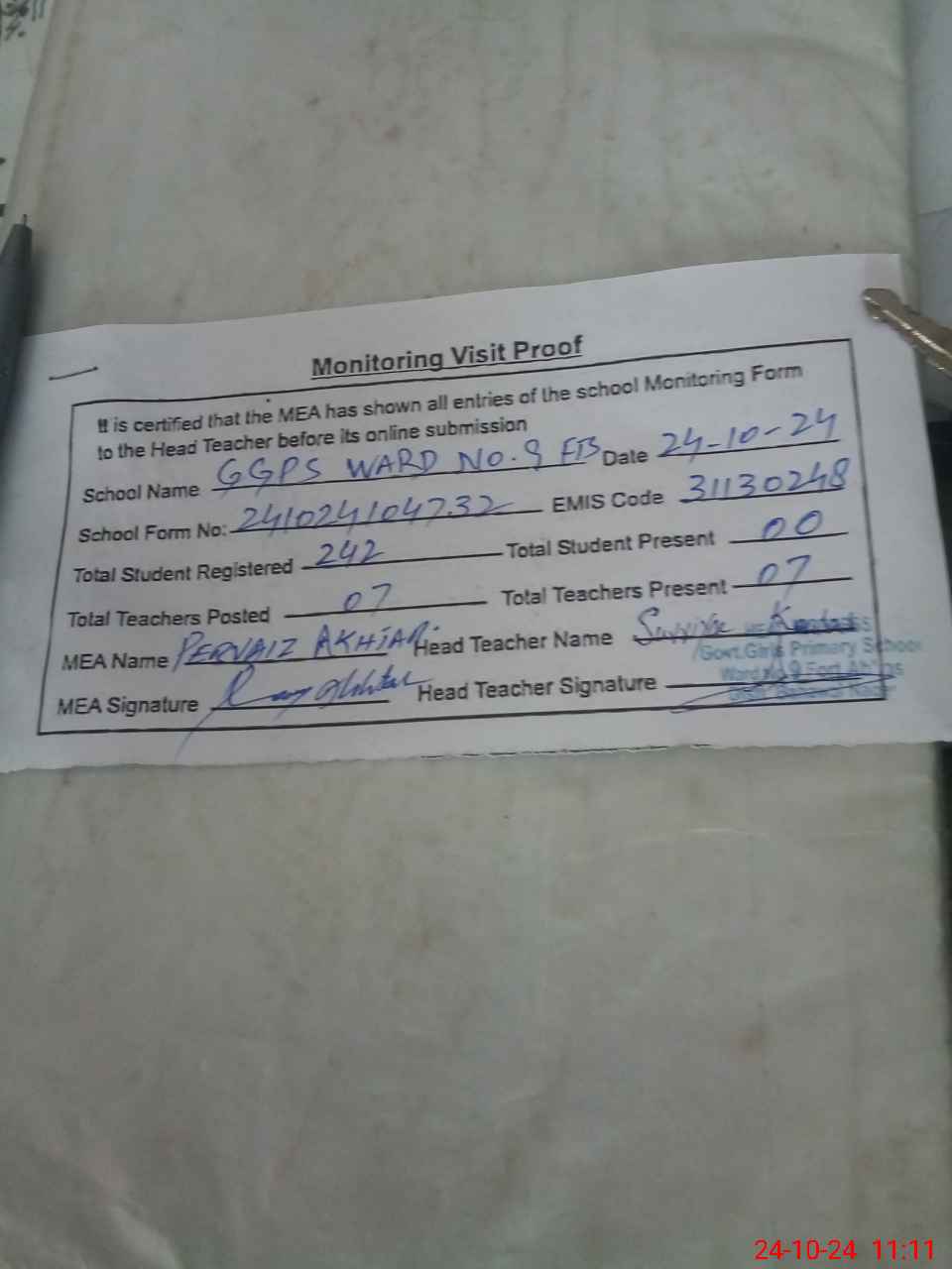 | Attendance Register | Head Teacher | MEA with School | Visit Proof |