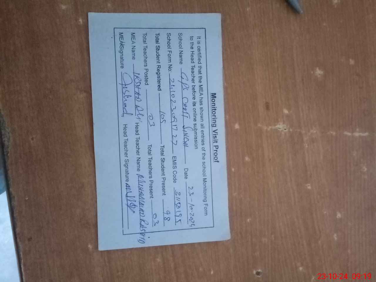 | Attendance Register | Head Teacher | MEA with School | Visit Proof |