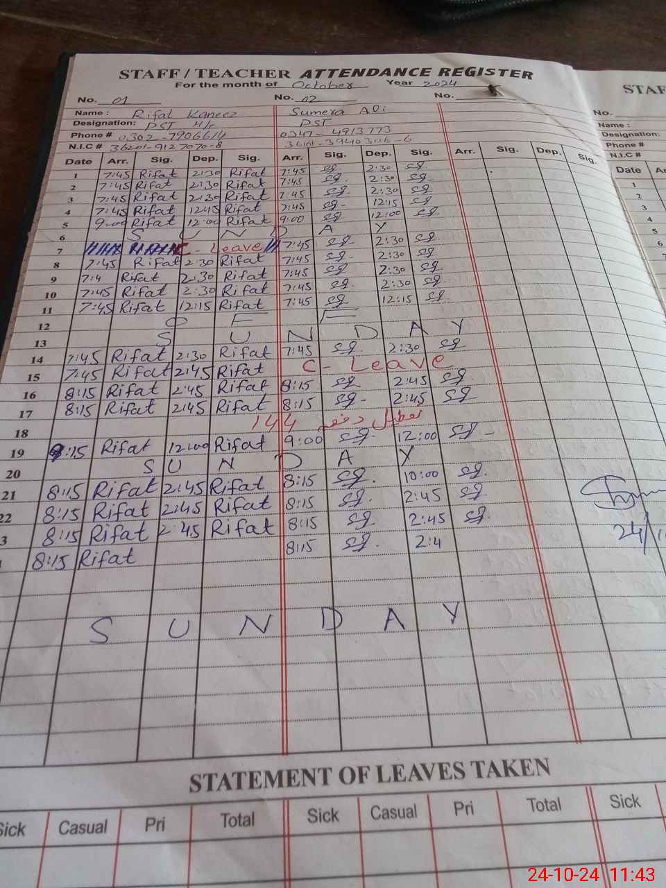 | CNIC | Full Name | Designation | R/C | Absence During Last Calender Month |