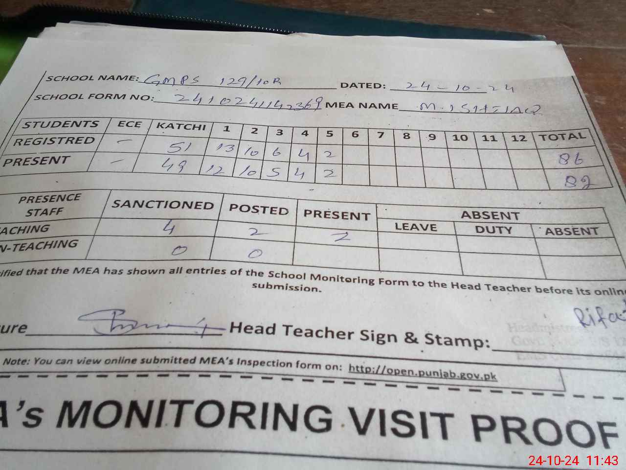 | Attendance Register | Head Teacher | MEA with School | Visit Proof |