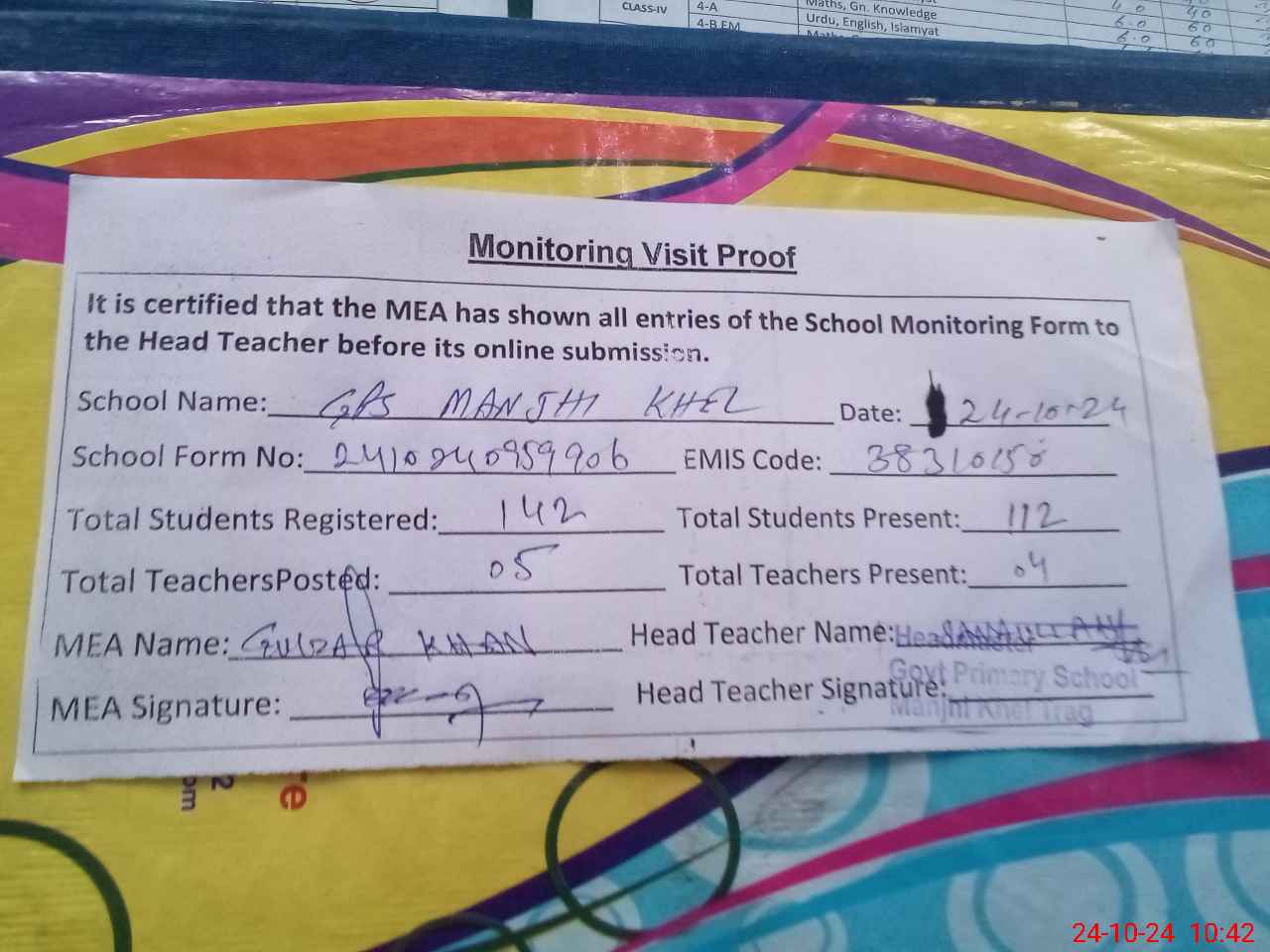 | Attendance Register | Head Teacher | MEA with School | Visit Proof |