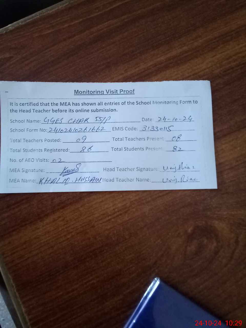 | Attendance Register | Head Teacher | MEA with School | Visit Proof |