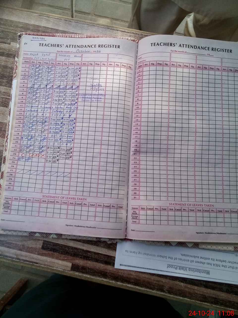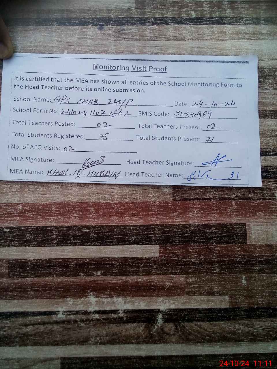 | Attendance Register | Head Teacher | MEA with School | Visit Proof |