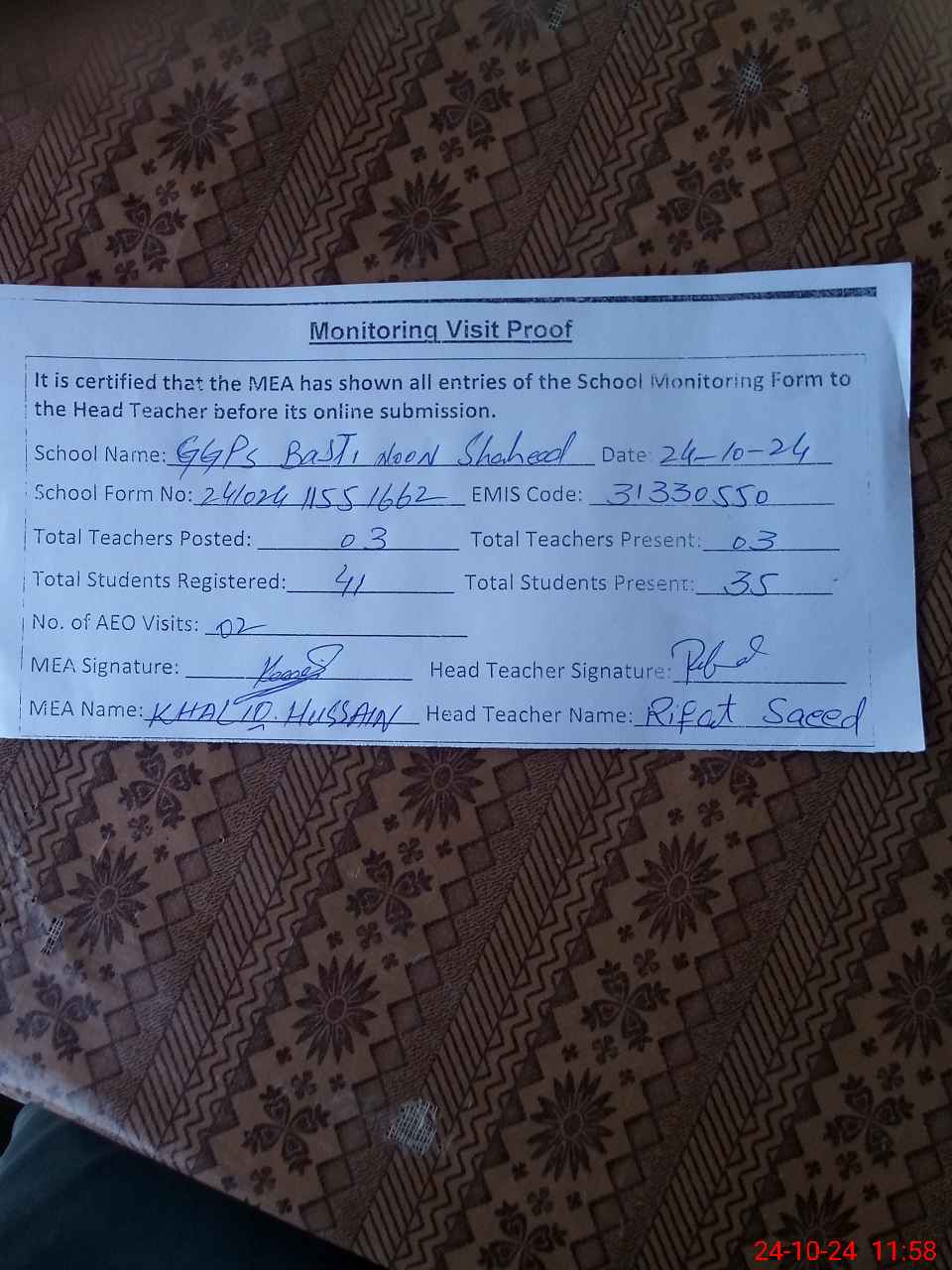 | Attendance Register | Head Teacher | MEA with School | Visit Proof |