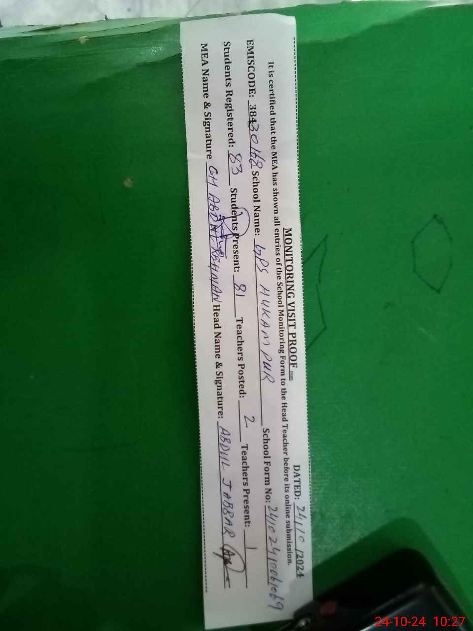 | Certified that this School was Inspected by the Undersigned MEA/DMO Today and the Information Stated Above is as Per Record. | |||||