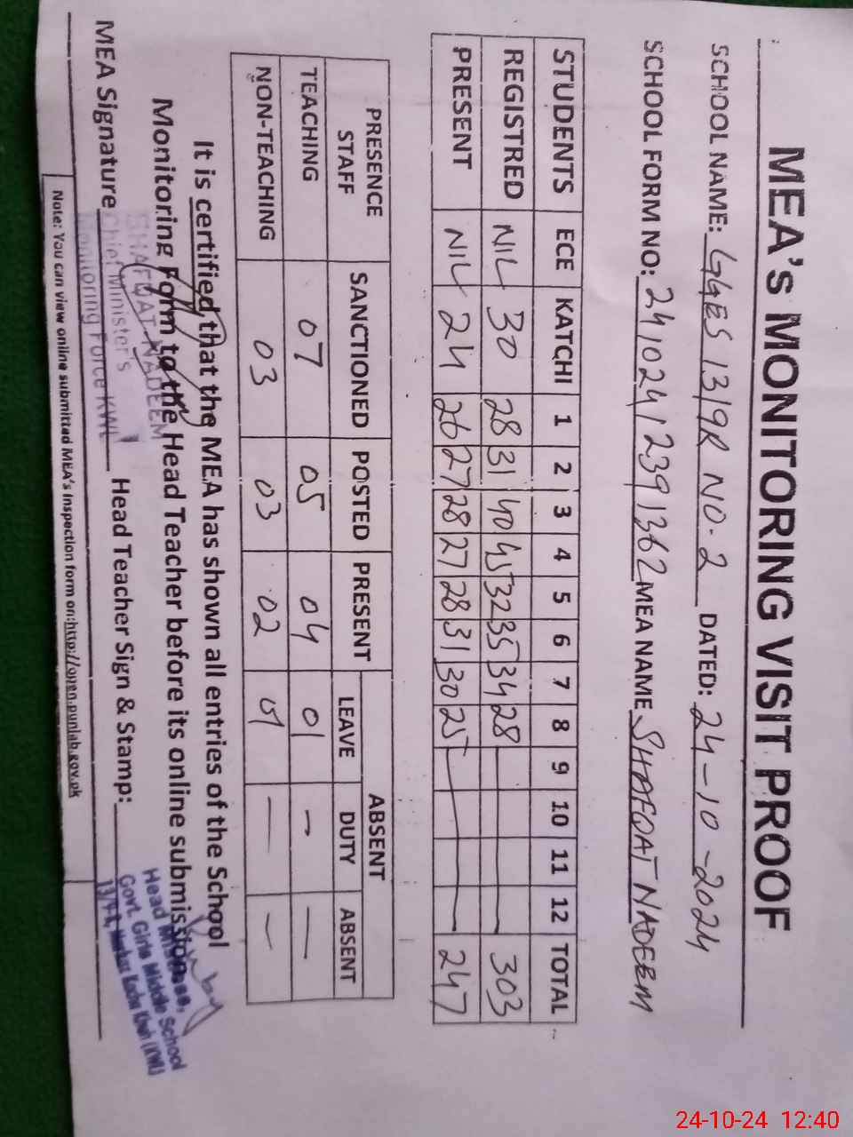 | Certified that this School was Inspected by the Undersigned MEA/DMO Today and the Information Stated Above is as Per Record. | |||||