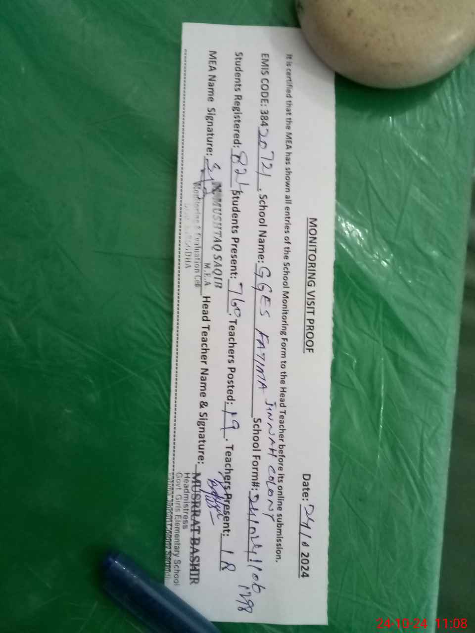 | Certified that this School was Inspected by the Undersigned MEA/DMO Today and the Information Stated Above is as Per Record. | |||||