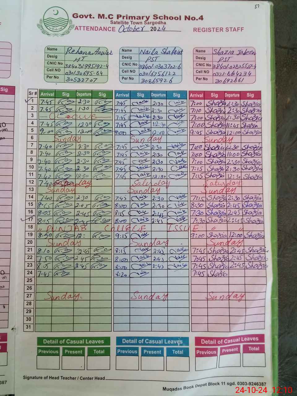 | CNIC | Full Name | Designation | R/C | Absence During Last Calender Month |
