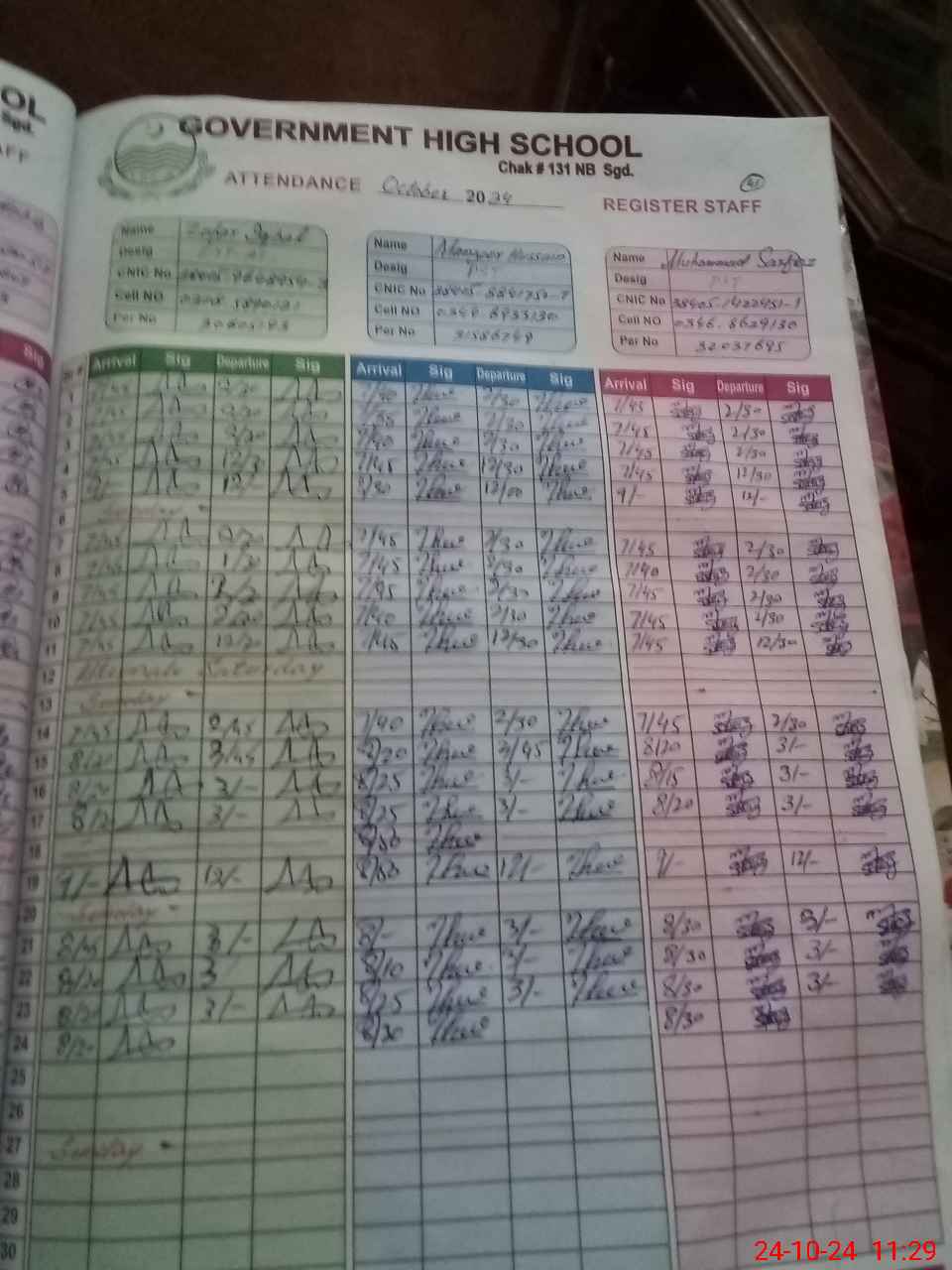 | CNIC | Full Name | Designation | R/C | Absence during last cal. month |