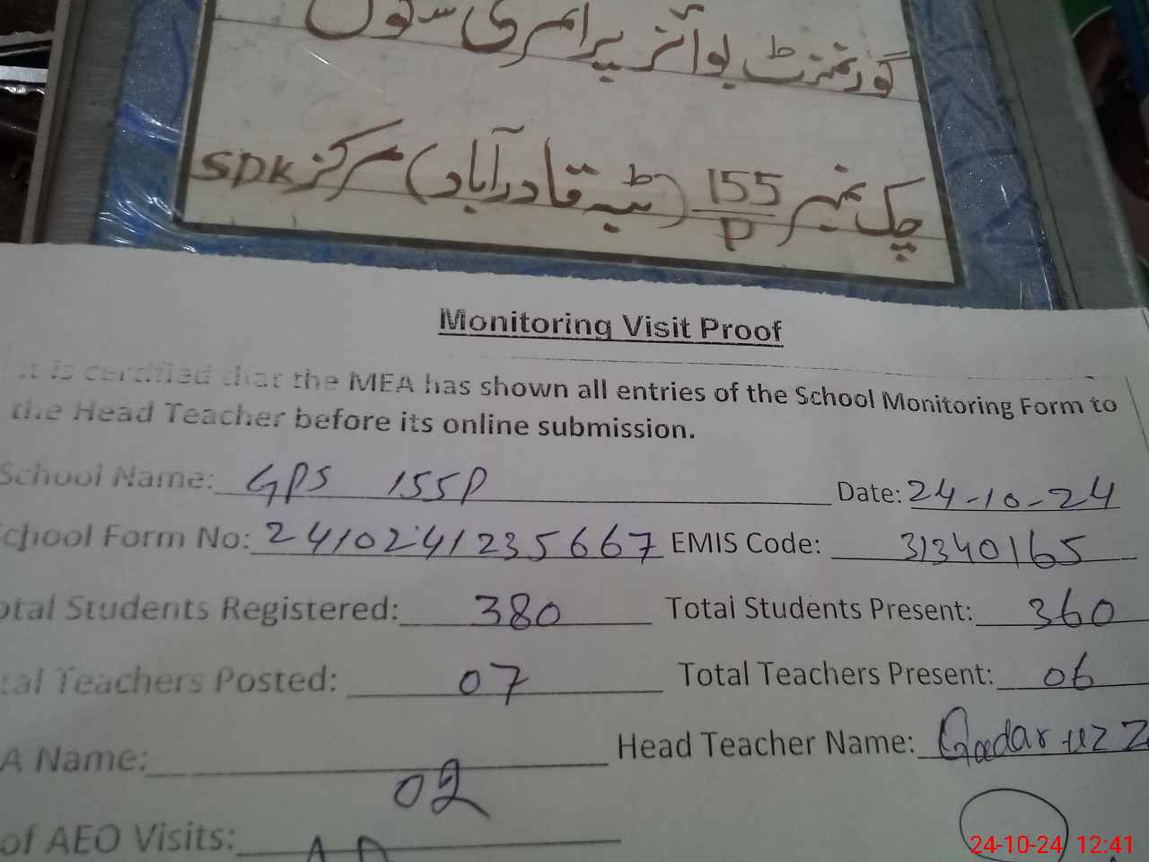 | Certified that this School was Inspected by the Undersigned MEA/DMO Today and the Information Stated Above is as Per Record. | |||||