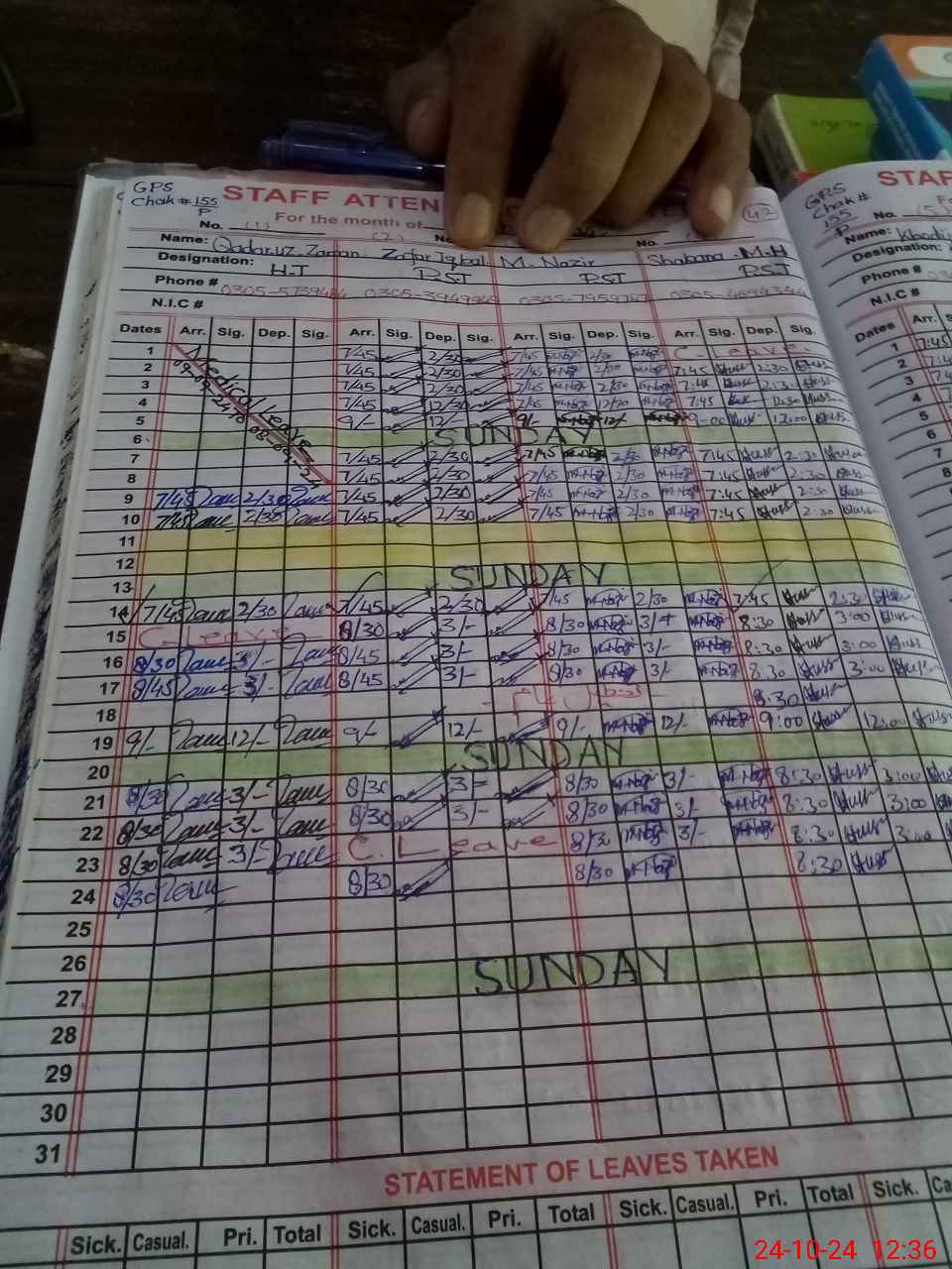| CNIC | Full Name | Designation | R/C | Absence during last cal. month |