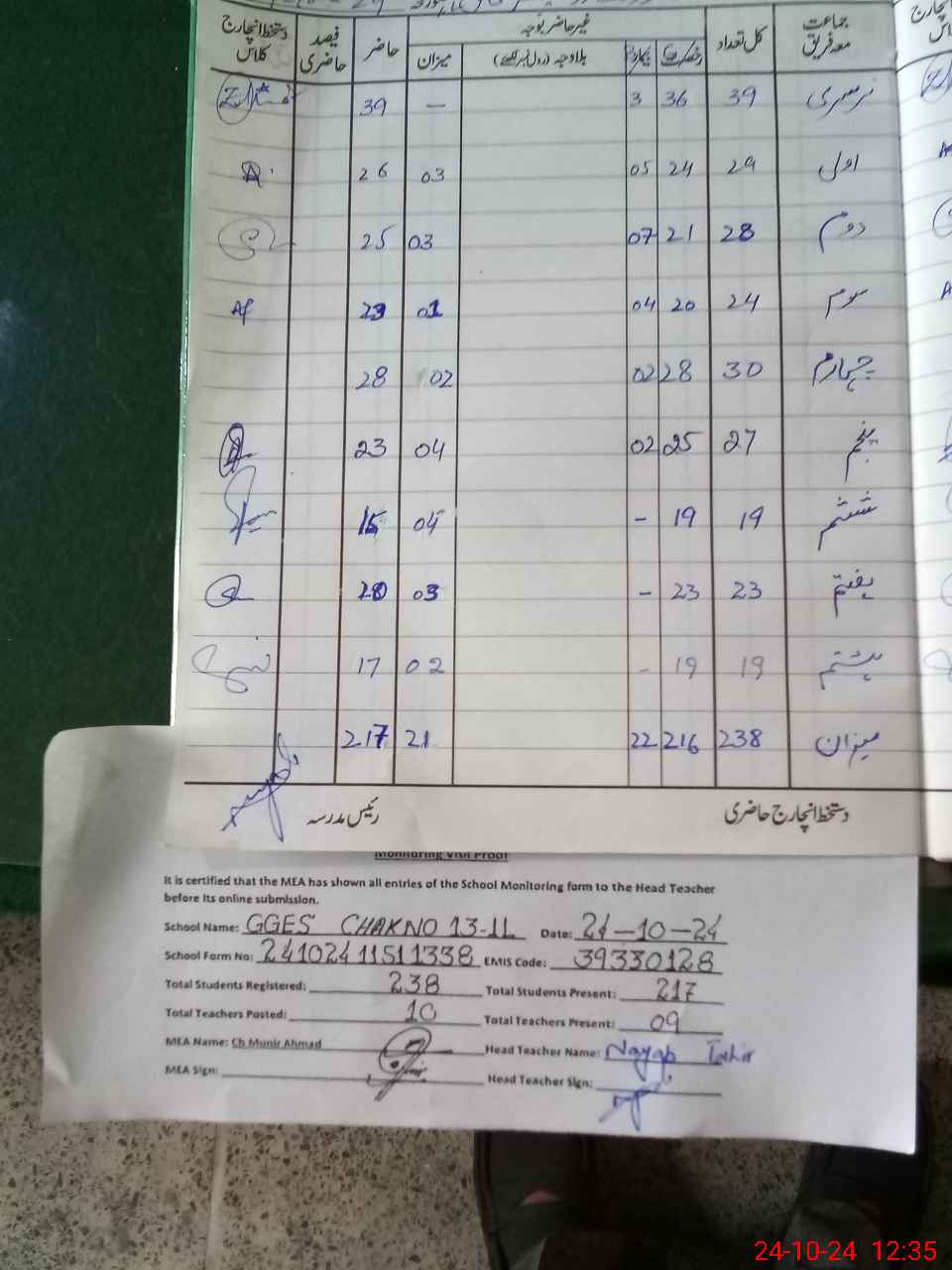 | Certified that this School was Inspected by the Undersigned MEA/DMO Today and the Information Stated Above is as Per Record. | |||||