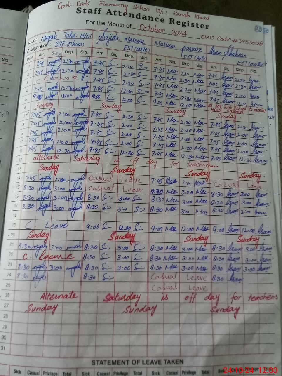 | Leave | Duty | Absent | Maternity | Medical | Ex- Pak |