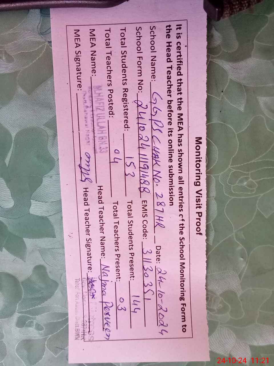 | Attendance Register | Head Teacher | MEA with School | Visit Proof |