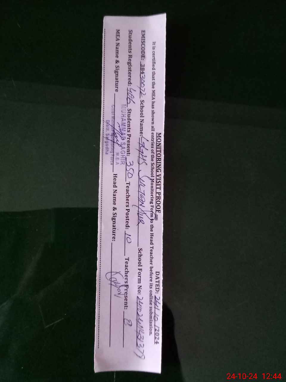 | Certified that this School was Inspected by the Undersigned MEA/DMO Today and the Information Stated Above is as Per Record. | |||||