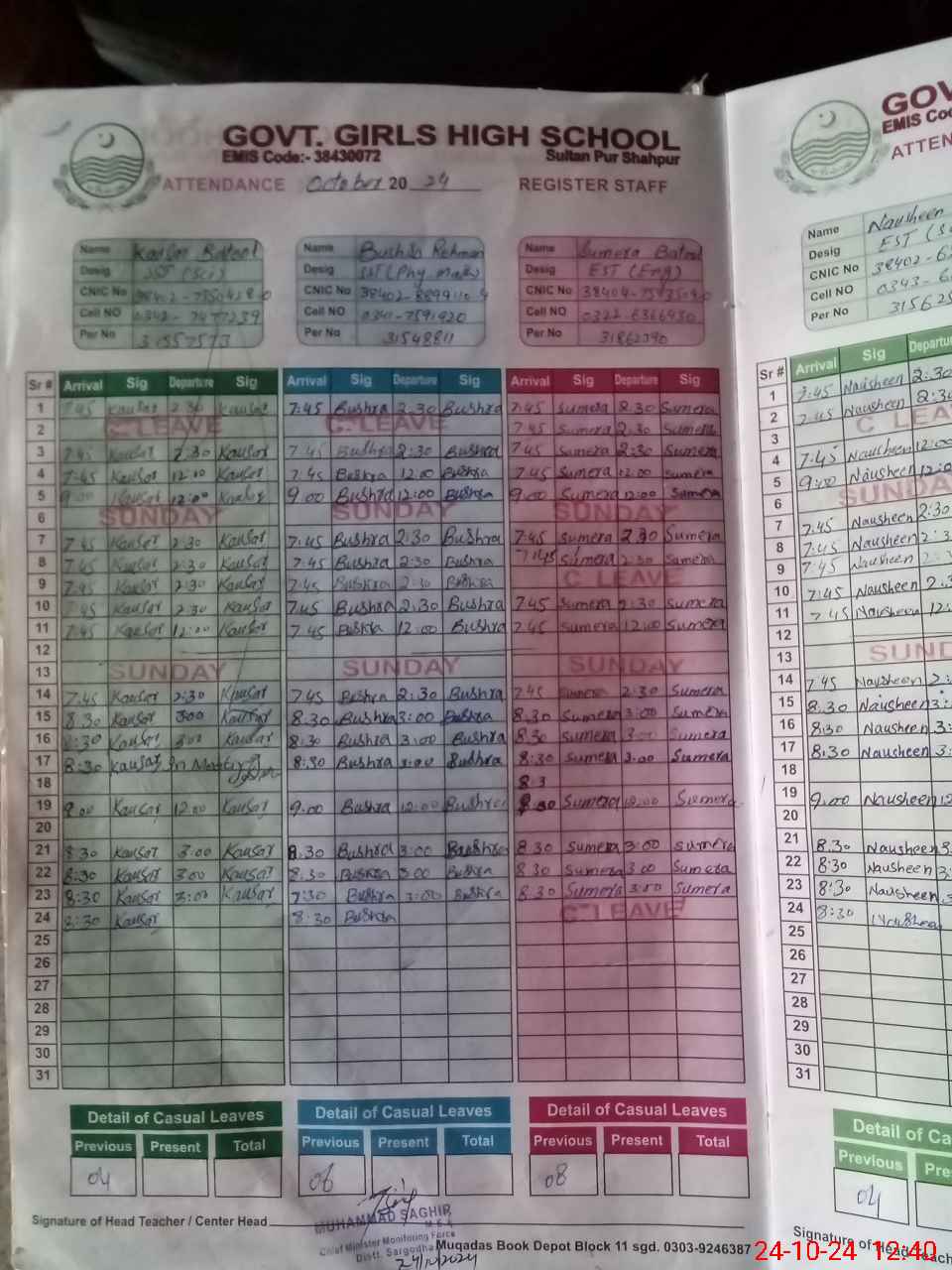 | CNIC | Full Name | Designation | R/C | Absence During Last Calender Month |